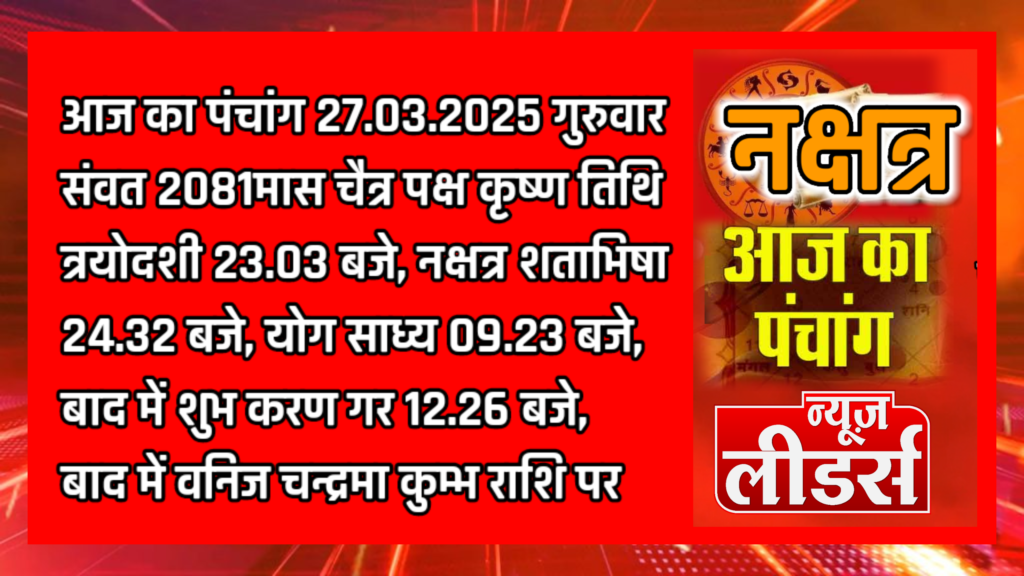 आज का पंचांग 27.03.2025 गुरुवार संवत 2081मास चैत्र पक्ष कृष्ण तिथि त्रयोदशी 23.03 बजे, नक्षत्र शताभिषा 24.32 बजे, योग साध्य 09.23 बजे, बाद में शुभ करण गर 12.26 बजे, बाद में वनिज चन्द्रमा कुम्भ राशि पर