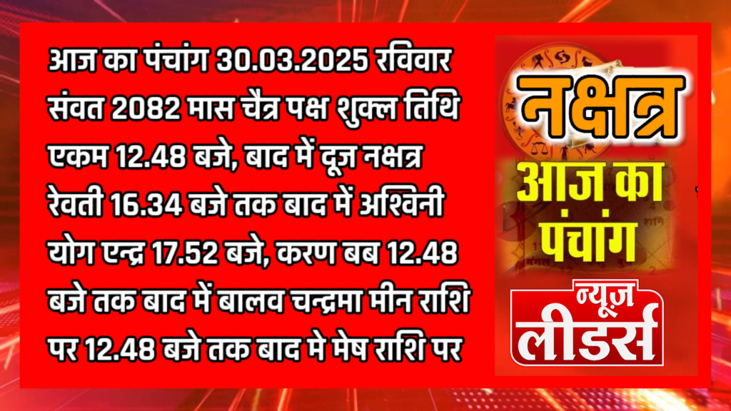 आज का पंचांग 30.03.2025 रविवार संवत 2082 मास चैत्र पक्ष शुक्ल तिथि एकम 12.48 बजे, बाद में दूज नक्षत्र रेवती 16.34 बजे तक बाद में अश्विनी