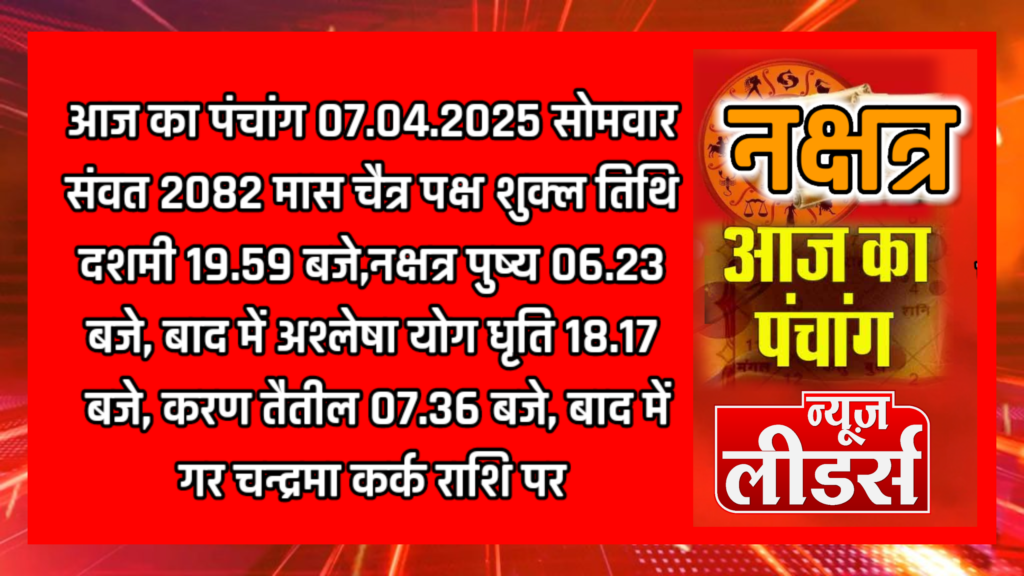 आज का पंचांग 07.04.2025 सोमवार संवत 2082 मास चैत्र पक्ष शुक्ल तिथि दशमी 19.59 बजे,नक्षत्र पुष्य 06.23 बजे, बाद में अश्लेषा योग धृति 18.17 बजे, करण तैतील 07.36 बजे, बाद में गर चन्द्रमा कर्क राशि