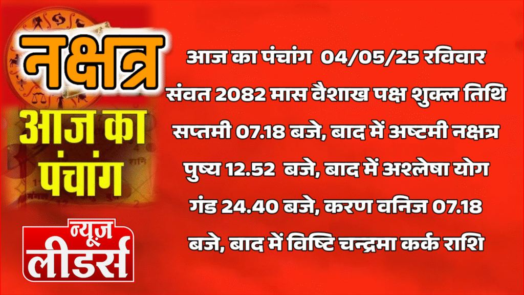 आज का पंचांग 04/05/25 रविवार संवत 2082 मास वैशाख पक्ष शुक्ल तिथि सप्तमी 07.18 बजे, बाद में अष्टमी नक्षत्र पुष्य 12.52 बजे, बाद में अश्लेषा योग