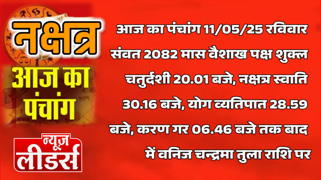 आज का पंचांग 11/05/25 रविवार संवत2082 मास वैशाख पक्ष शुक्ल चतुर्दशी 20.01 बजे, नक्षत्र स्वाति 30.16 बजे, योग व्यतिपात 28.59 बजे, करण गर 06.46 बजे तक बाद में वनिज चन्द्रमा तुला राशि पर