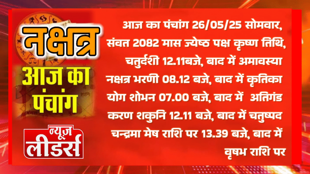 आज का पंचांग 26/05/25 सोमवार, संवत 2082 मास ज्येष्ठ पक्ष कृष्ण तिथि, चतुर्दशी 12.11बजे, बाद में अमावस्या नक्षत्र भरणी 08.12 बजे, बाद में कृतिका, योग शोभन 07.00 बजे, बाद में अतिगंड करण शकुनि 12.11 बजे, बाद में चतुष्पद चन्द्रमा मेष राशि पर 13.39 बजे, बाद में वृषभ राशि पर