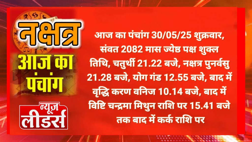 आज का पंचांग 30/05/25 शुक्रवार, संवत 2082 मास ज्येष्ठ पक्ष शुक्ल तिथि, चतुर्थी 21.22 बजे, नक्षत्र पुनर्वसु 21.28 बजे, योग गंड 12.55 बजे, बाद में वृद्धि करण वनिज 10.14 बजे, बाद में विष्टि चन्द्रमा मिथुन राशि पर 15.41 बजे तक बाद में कर्क राशि पर