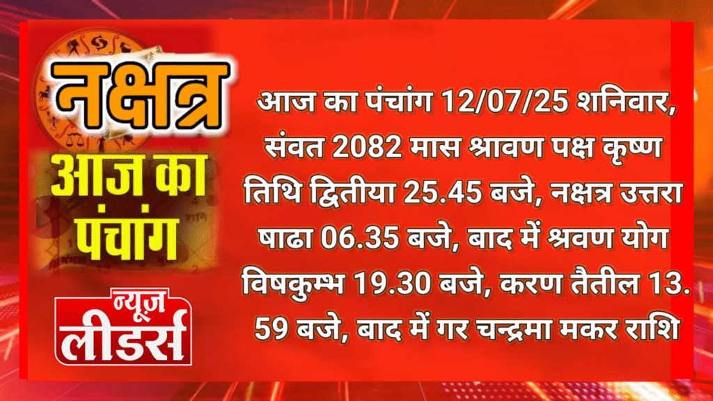 आज का पंचांग 12/07/25 शनिवार,संवत 2082 मास श्रावण पक्ष कृष्ण तिथि द्वितीया 25.45 बजे, नक्षत्र उत्तरा षाढा 06.35 बजे, बाद में श्रवण योग विषकुम्भ 19.30 बजे तक, करण तैतील 13.59 बजे तक बाद में गर चन्द्रमा मकर राशि पर