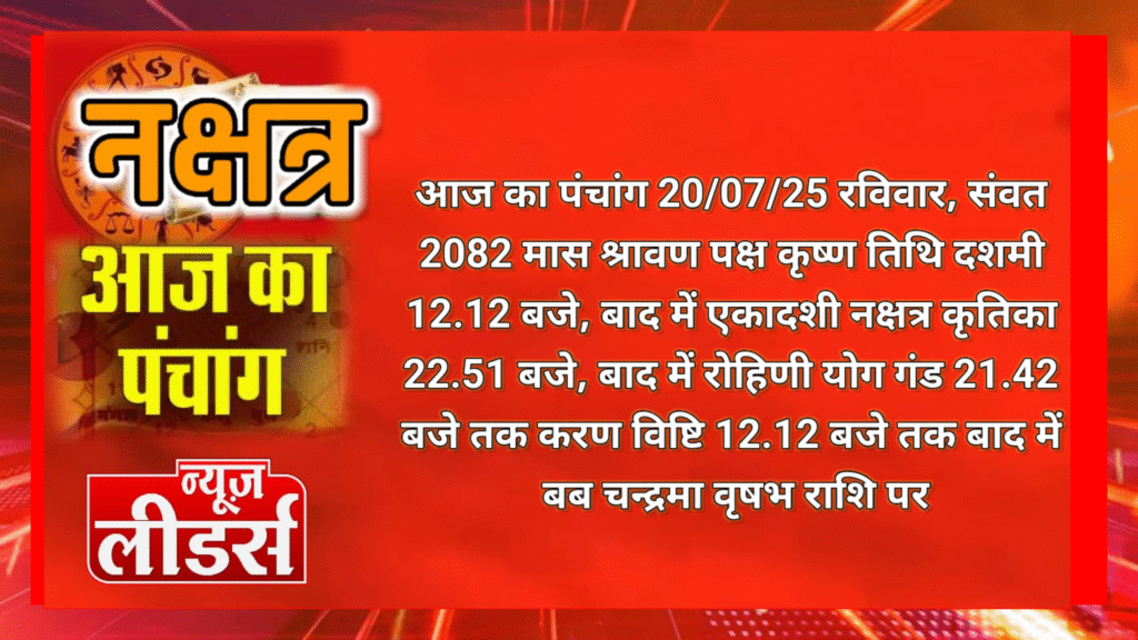 आज का पंचांग 20/07/25 रविवार, संवत 2082 मास श्रावण पक्ष कृष्ण तिथि दशमी 12.12 बजे, बाद में एकादशी नक्षत्र कृतिका 22.51 बजे, बाद में रोहिणी योग गंड 21.42 बजे तक करण विष्टि 12.12 बजे तक बाद में बब चन्द्रमा वृषभ राशि पर