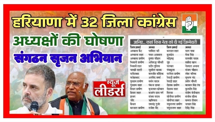 NEWS Leaders : संगठन सृजन अभियान के तहत हरियाणा में 32 जिला कांग्रेस अध्यक्षों की घोषणा, मध्यप्रदेश में भी शीघ्र होगा जिला कांग्रेस अध्यक्षों का ऐलान
