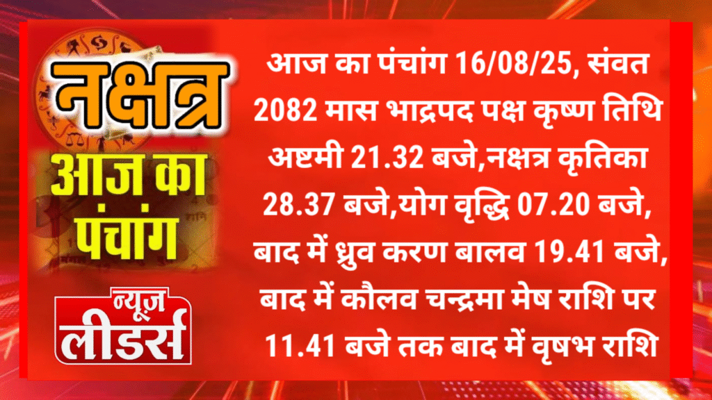 आज का पंचांग 16/08/25, संवत 2082 मास भाद्रपद पक्ष कृष्ण तिथि अष्टमी 21.32 बजे,नक्षत्र कृतिका 28.37 बजे, योग वृद्धि 07.20 बजे, बाद में ध्रुव करण बालव 19.41 बजे, बाद में कौलव चन्द्रमा मेष राशि पर 11.41 बजे तक बाद मे वृषभ राशि