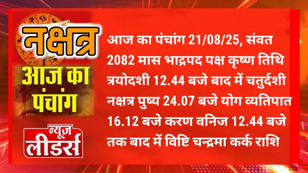 आज का पंचांग 21/08/25, संवत 2082 मास भाद्रपद पक्ष कृष्ण तिथि त्रयोदशी 12.44 बजे बाद में चतुर्दशी नक्षत्र पुष्य 24.07 बजे योग व्यतिपात 16.12 बजे करण वनिज 12.44 बजे तक बाद में विष्टि चन्द्रमा कर्क राशि पर