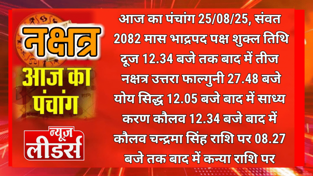 आज का पंचांग 25/08/25, संवत 2082 मास भाद्रपद पक्ष शुक्ल तिथि दूज 12.34 बजे तक बाद में तीज नक्षत्र उत्तरा फाल्गुनी 27.48 बजे योय सिद्ध 12.05 बजे बाद में साध्य