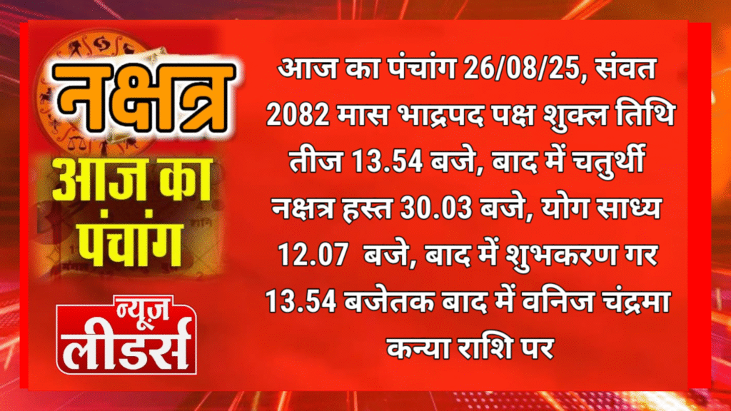 आज का पंचांग 26/08/25, संवत 2082 मास भाद्रपद पक्ष शुक्ल तिथि तीज 13.54 बजे, बाद में चतुर्थी नक्षत्र हस्त 30.03 बजे, योग साध्य 12.07 बजे, बाद में शुभकरण गर