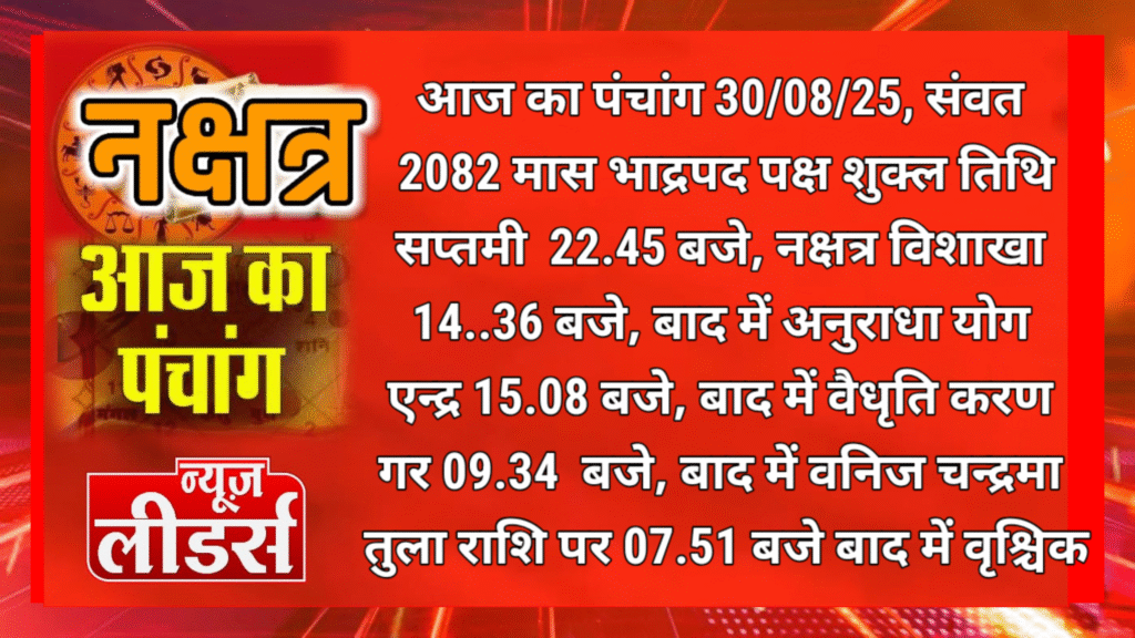 आज का पंचांग 30/08/25, संवत 2082 मास भाद्रपद पक्ष शुक्ल तिथि सप्तमी 22.45 बजे, नक्षत्र विशाखा 14.36 बजे, बाद में अनुराधा योग एन्द्र 15.08 बजे, बाद में वैधृति करण गर 09.34 बजे, बाद में वनिज चन्द्रमा तुला राशि पर 07.51 बजे बाद में वृश्चिक.