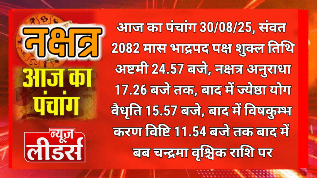आज का पंचांग 31/08/25, संवत 2082 मास भाद्रपद पक्ष शुक्ल तिथि अष्टमी 24.57 बजे, नक्षत्र अनुराधा.17.26 बजे तक, बाद में ज्येष्ठा योग वैधृति 15.57 बजे, बाद में विषकुम्भ