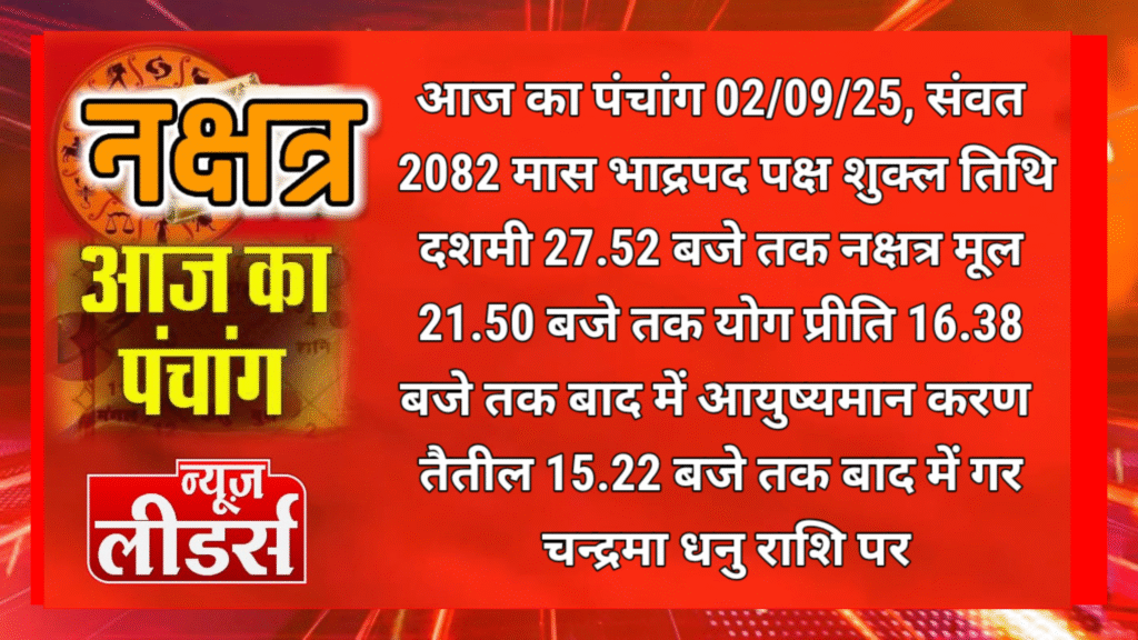 आज का पंचांग 02/09/25, संवत 2082 मास भाद्रपद पक्ष शुक्ल तिथि दशमी 27.52 बजे तक नक्षत्र मूल 21.50 बजे तक योग प्रीति 16.38 बजे तक बाद में आयुष्यमान करण तैतील 15.22 बजे तक बाद में गर चन्द्रमा धनु राशि पर
