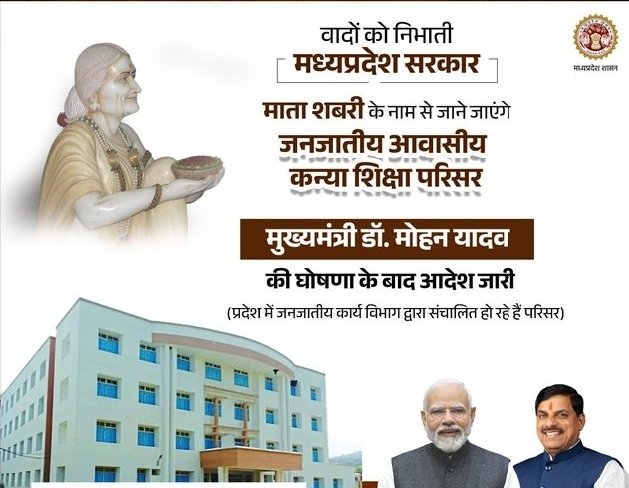 मुख्यमंत्री डॉ. मोहन यादव की घोषणा के परिपालन में जनजातीय कार्य विभाग द्वारा संचालित कन्या शिक्षा परिसरों का नाम अब माता शबरी आवासीय कन्या शिक्षा परिसर होगा। राज्य सरकार ने इस आशय के आदेश मंगलवार को जारी कर दिए हैं।