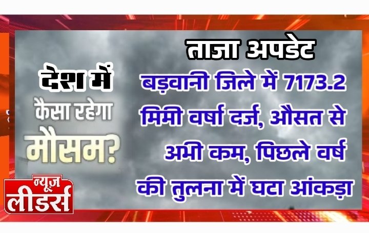 NEWS Leaders : बड़वानी जिले में अब तक 7173.2 मिमी वर्षा दर्ज,औसत से अभी कम, पिछले वर्ष की तुलना में घटा आंकड़ा, देश में क्या है मौसम का अनुमान जानिए