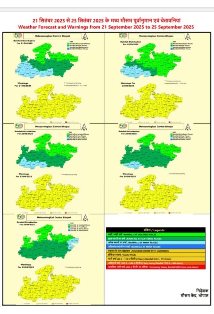 मौसम विज्ञान केंद्र, भोपाल ने राज्य के कई जिलों के लिए 21 सितंबर 2025 के लिए येलो अलर्ट जारी किया है, इन जिलों में कहीं-कहीं भारी वर्षा, तेज हवा और आकाशीय बिजली गिरने की संभावना जताई गई है।