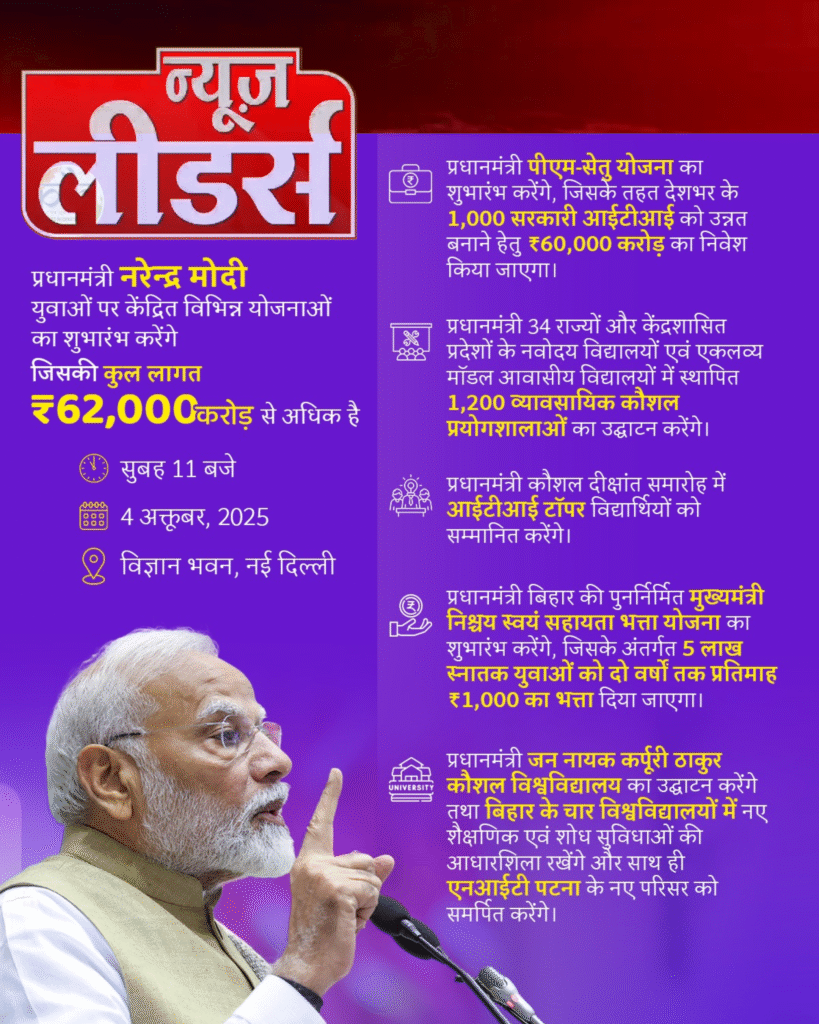 Newsleaders : प्रधानमंत्री मोदी कल 62 हज़ार करोड़ की युवा-केंद्रित योजनाओं का शुभारंभ करेंगे