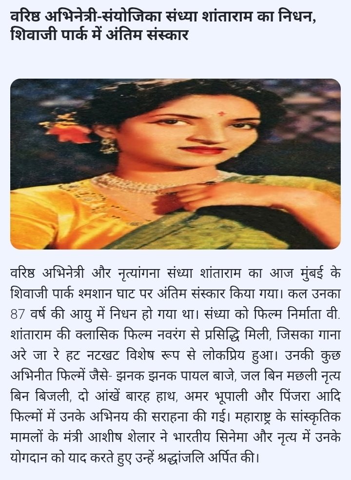वरिष्ठ अभिनेत्री-संयोजिका संध्या शांताराम का निधन, शिवाजी पार्क में अंतिम संस्कार