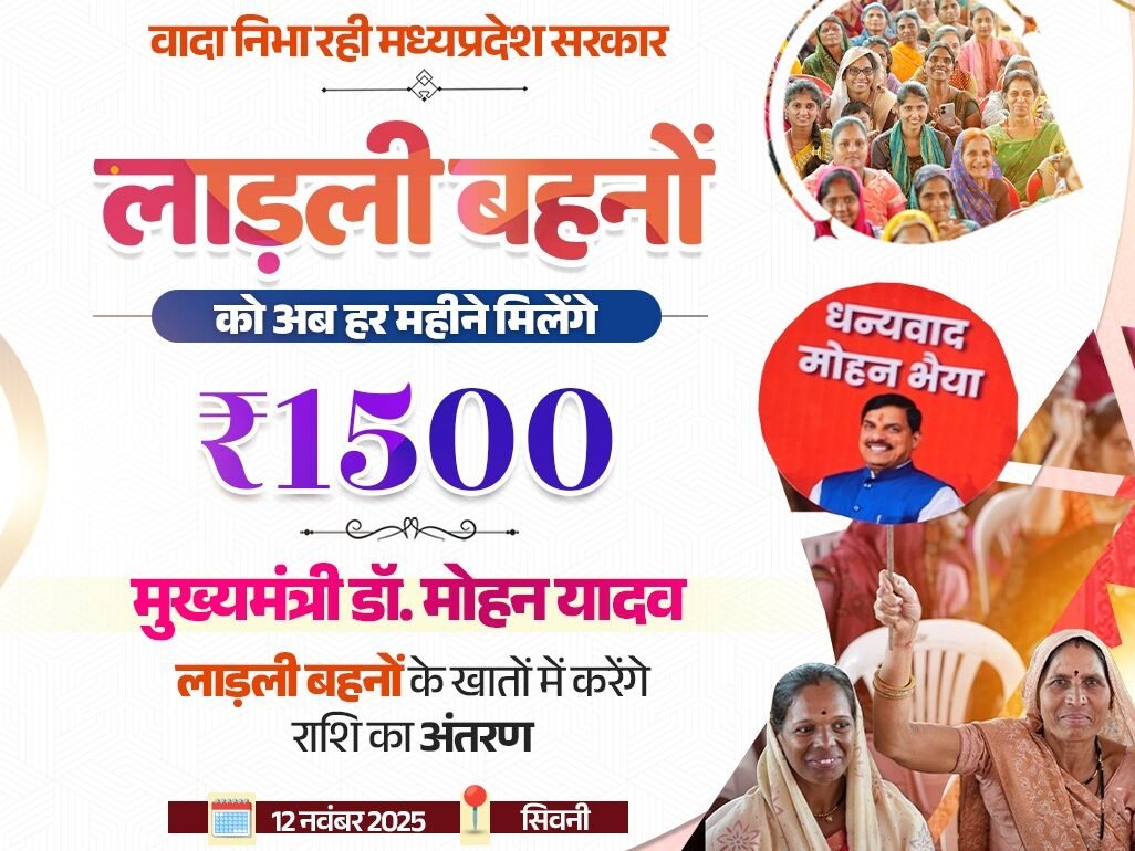 मुख्यमंत्री डॉ. मोहन यादव लाड़ली बहनों के खातों में करेंगे राशि का अंतरण🗓️ 12 नवंबर 2025📍 सिवनी