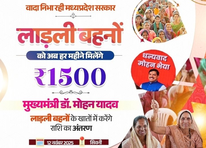 मुख्यमंत्री डॉ. मोहन यादव लाड़ली बहनों के खातों में करेंगे राशि का अंतरण🗓️ 12 नवंबर 2025📍 सिवनी