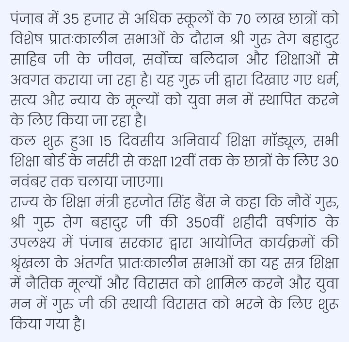 पंजाब में छात्रों को श्री गुरु तेग बहादुर साहिब जी के सर्वोच्च बलिदान से अवगत कराया जा रहा