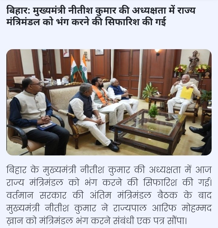 बिहार के मुख्यमंत्री और उपमुख्यमंत्री ने राज्यपाल आरिफ मोहम्मद खान से मुलाकात की और उन्हें राज्य मंत्रिमंडल के भंग होने के फैसले की जानकारी दी।