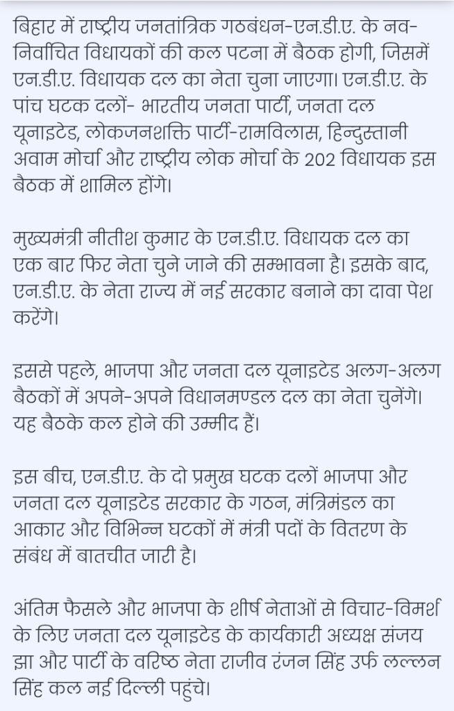 बिहार में एनडीए के नवनिर्वाचित विधायक कल पटना में अपने नेता का चुनाव करेंगे