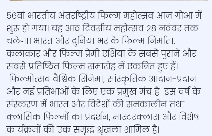 “यह प्रतिष्ठित फिल्म महोत्सव 20 से 28 नवंबर 2025 तक चलेगा। इसमें 81 देशों की 240 से अधिक फिल्में प्रदर्शित की जाएंगी।यह सिनेमा, संस्कृति और नवाचार का एक बड़ा संगम होने वाला है”