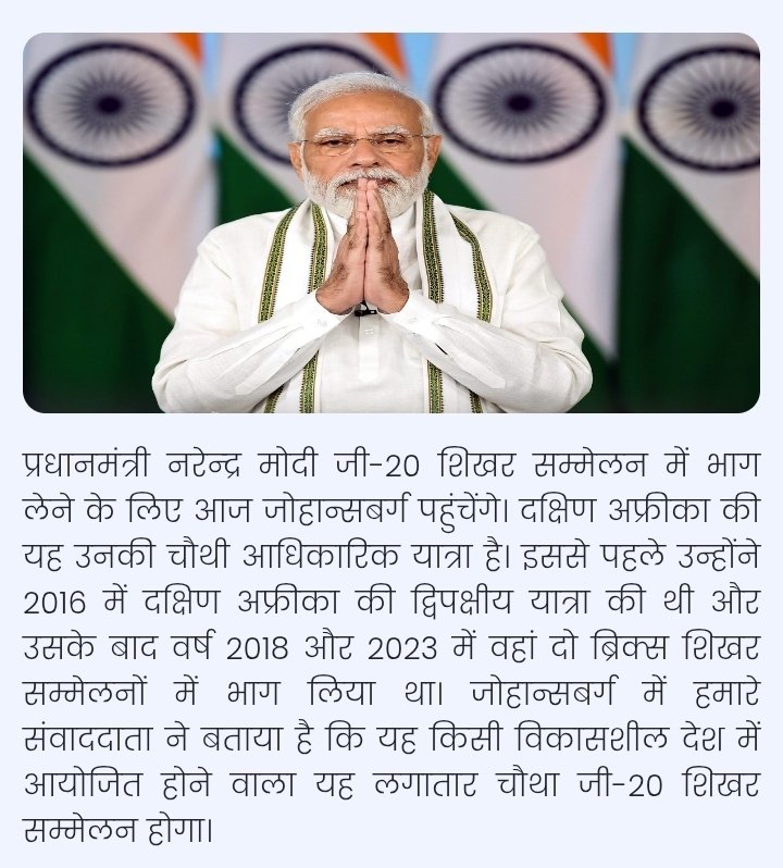 प्रधानमंत्री श्री नरेन्द्र मोदी 20वें G20 नेताओं के शिखर सम्मेलन में भाग लेने के लिए दक्षिण अफ्रीका के जोहान्सबर्ग के लिए रवाना हुए।