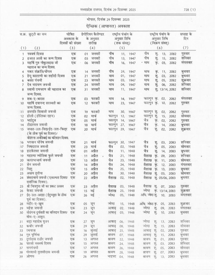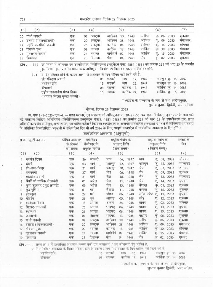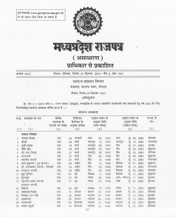 मध्य प्रदेश राज्य सरकार ने वर्ष 2026 के लिए सरकारी अवकाश/पब्लिक हॉलिडे कैलेंडर की सूची जारी की है।