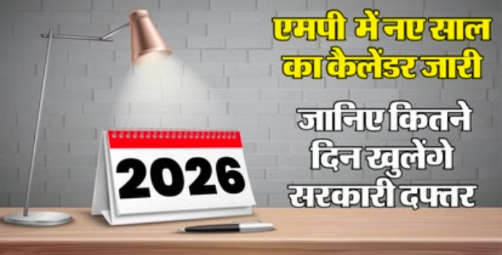 मध्यप्रदेश सरकार ने वर्ष 2026 के लिए सरकारी कार्यालयों की छुट्टियों और कामकाज का पूरा कार्यक्रम जारी कर दिया है। नए कैलेंडर के अनुसार साल 2026 में सरकारी दफ्तर कुल 238 दिन खुलेंगे, जबकि कर्मचारियों को 127 दिन की छुट्टी मिलेगी। इसमें 52 शनिवार, 52 रविवार और 23 सार्वजनिक अवकाश शामिल हैं।